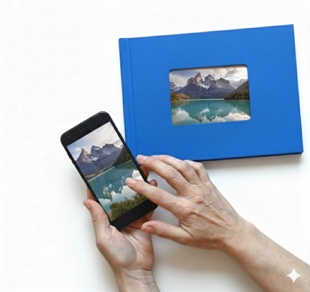 La ventana deja ver la primera foto del libro, aportando un detalle elegante y personalizado.